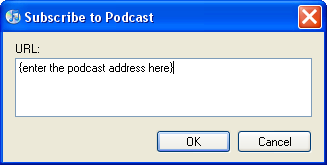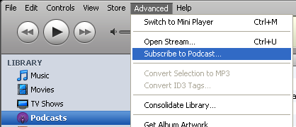 - Run iTunes and select “Subscribe to Podcast” from the “Advanced” menu,